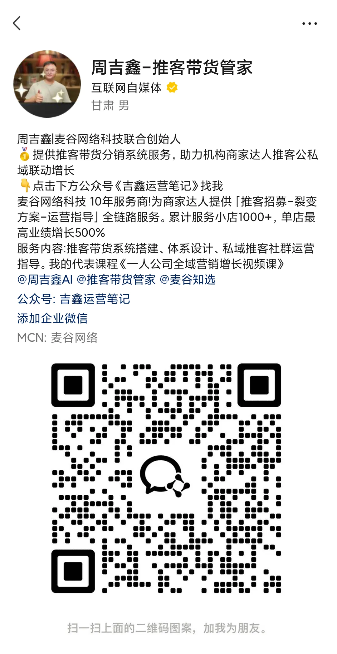 我叫周吉鑫,微信创业10年+ 麦谷网络科技联合创始人 麦谷网络科技 微信服务商、联盟带货机构 🥇提供:微信小店全域推客分销带货运营解决方案