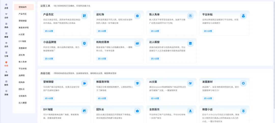 全链路管理:从推客一键快速注册合作、直播间/带货短视频等内容分发在到订单结算,