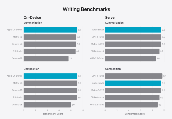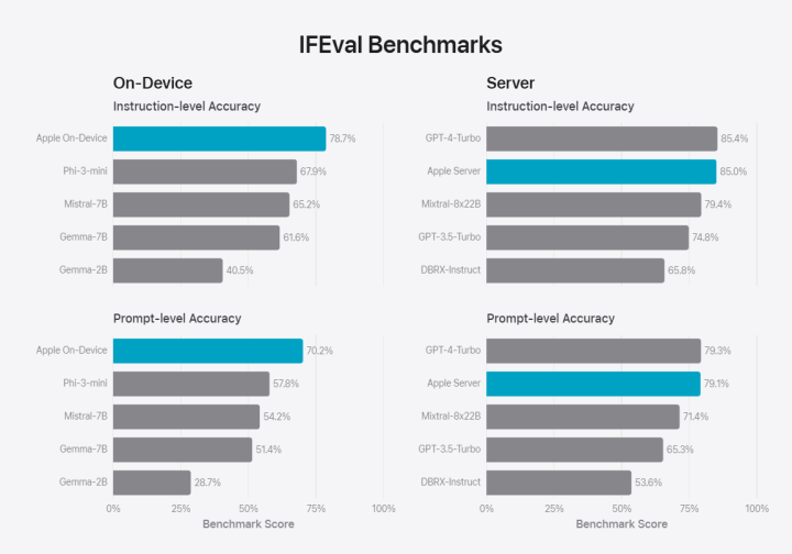 在指令跟踪评估(IFEval)测试中,苹果本地模型性能优于包括 Phi-3-mini、Mistral-7B 和 Gemma-7B 等模型,且与 DBRX-Instruct、Mixtral-8x22B 和 GPT-3.5-Turbo 相比毫不逊色;而云上模型水平基本与 GPT-4-Turbo 持平。 [3]