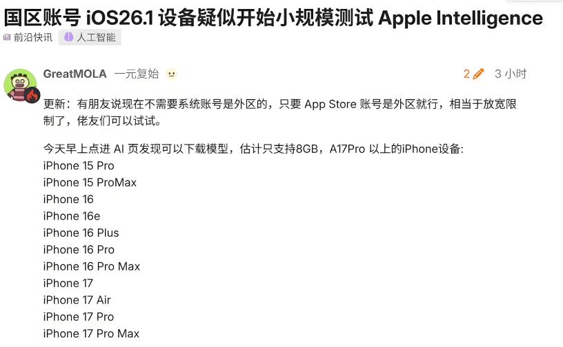 2025年10月27日,博主GreatMOLA在Linux Do论坛发文,称自己的港行苹果iPhone手机可以下载 Apple 智能模型,启用后发现确实可以使用。根据博主的实测,他使用 Siri 搜索东西时会列出搜狐、百度、微博等详情页,且跳转详情也有百度。按照他的说法,虽然他的Siri样子变了,但还是“极为智障”,不知道使用的是什么模型,且只会使用百度搜索,因此他才觉得这是小规模测试的征兆。博主后来更新回复,外版 iPhone手机只需要App Store账户是外区、手机本身登陆的苹果账号都是国区也能使用Apple智能 [34]。