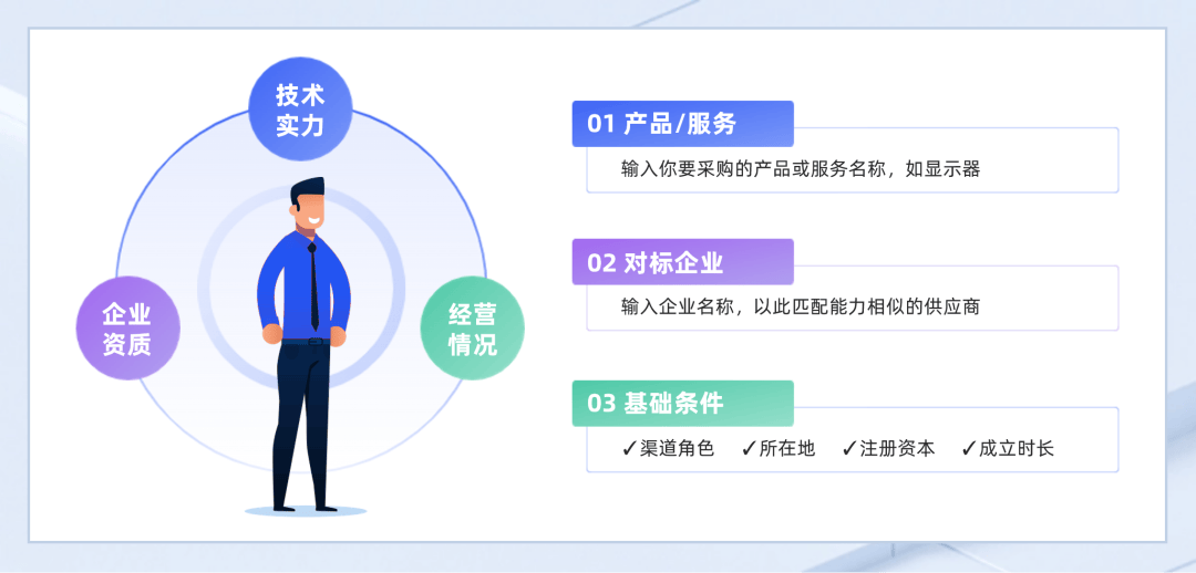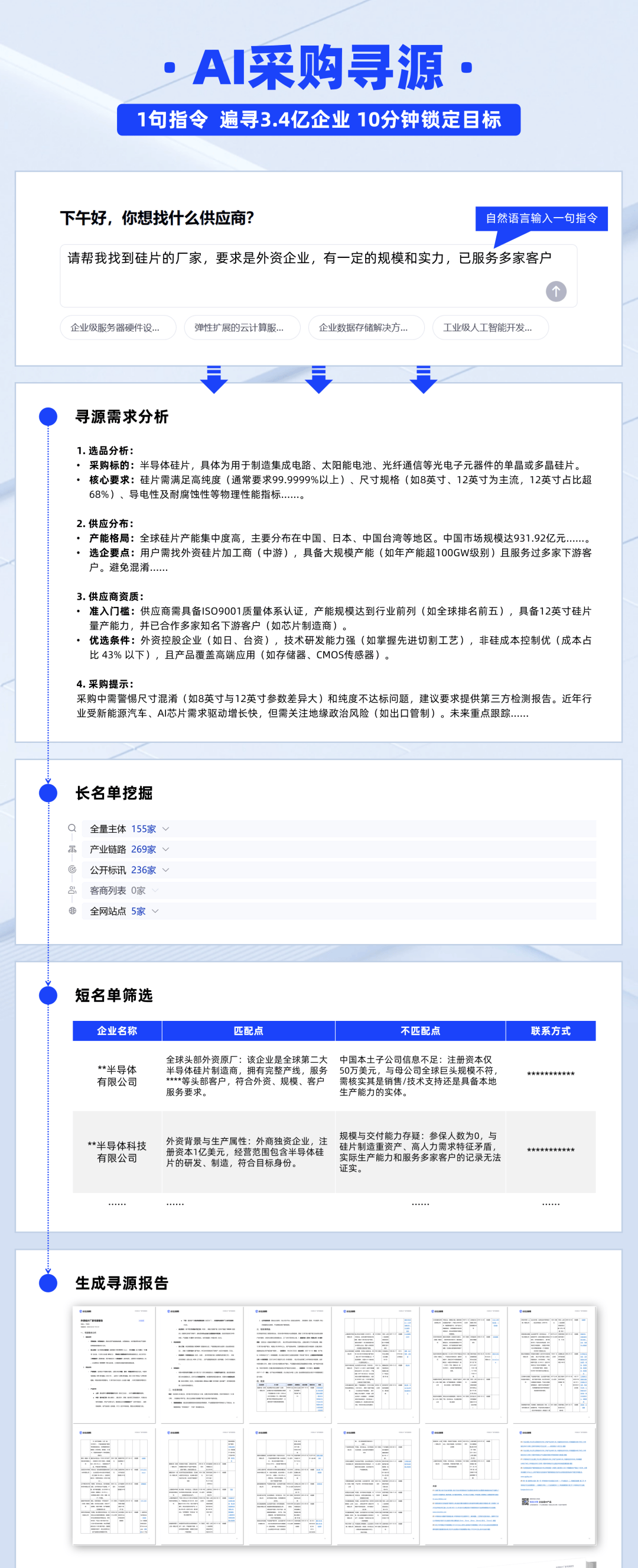- 需求精准匹配:支持技术参数、认证标准、产能规模等复杂条件筛选,快速定位高匹配度供应商,提升寻源效率。