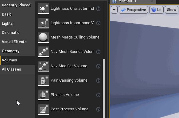点击Apply然后主编辑器。在模式面板(Mode Panel)的体积(Volumes)分类中找到后期处理体积(Post Process Volume),然后将它拖拽入视口。