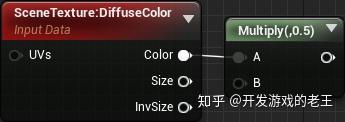 再创建一个SceneTexture节点,并将Scene Texture Id改为Diffuse Color,然后用Color乘以0.5从而获得亮度减半的漫反射颜色值。