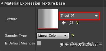 然后创建一个Texture Sample节点并将其Texture设置为“T_Lut_01”。这个LUT将会产生3个带有柔和过渡的色段。
