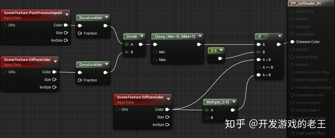 Desaturation节点将把Post Process Input和Diffuse Color转换成灰度图像Divide节点将Post Process Input除以Diffuse Color,是我们获得光照缓存。Clamp节点是出数值介于0到1之间。If节点,使光照值高于0.5的像素输出正常颜色,使小于0.5的像素输出亮度减半的颜色。这样你就得到了你的卡通着色器,你需要把它应用到场景中。