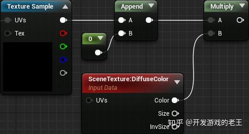之所以要用Append节点将Texture Sample 节点的输出转换为4维向量。因为3维向量无法和4维向量(场景纹理)相乘。