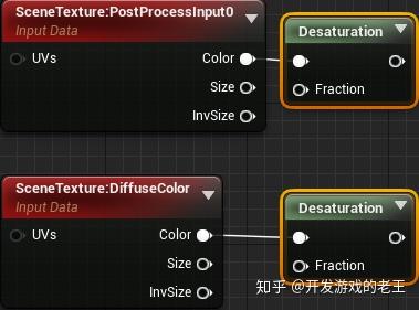 光照缓冲(lighting buffer)仅包含描述光照量的灰度值。这意味着我们不需要两个缓冲区中的颜色信息。我们可以将两个SceneTexture节点的颜色输出连接到一个Desaturation节点(去饱和度节点)来去除颜色信息。这样两个缓冲区的颜色就被完全去除了。
