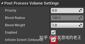 默认情况下,后期处理体积只会影响其范围内的对象,但本例中,我们想让它影响这个世界,所以要启用它的Infinite Extent (Unbound)选项。