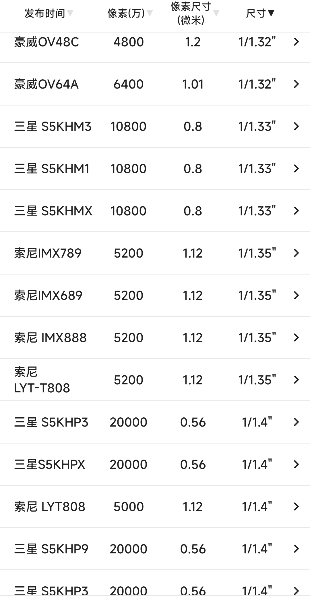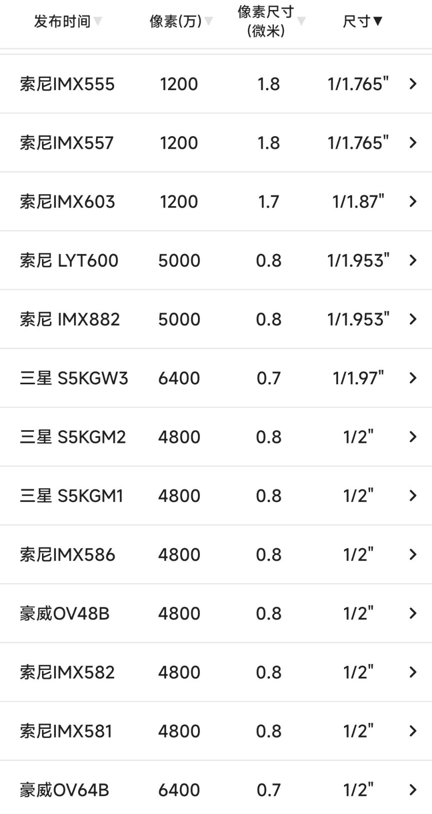 再往后就是比较旧的主摄传感器,或者是作为副摄、超广、长焦使用,仅供参考: