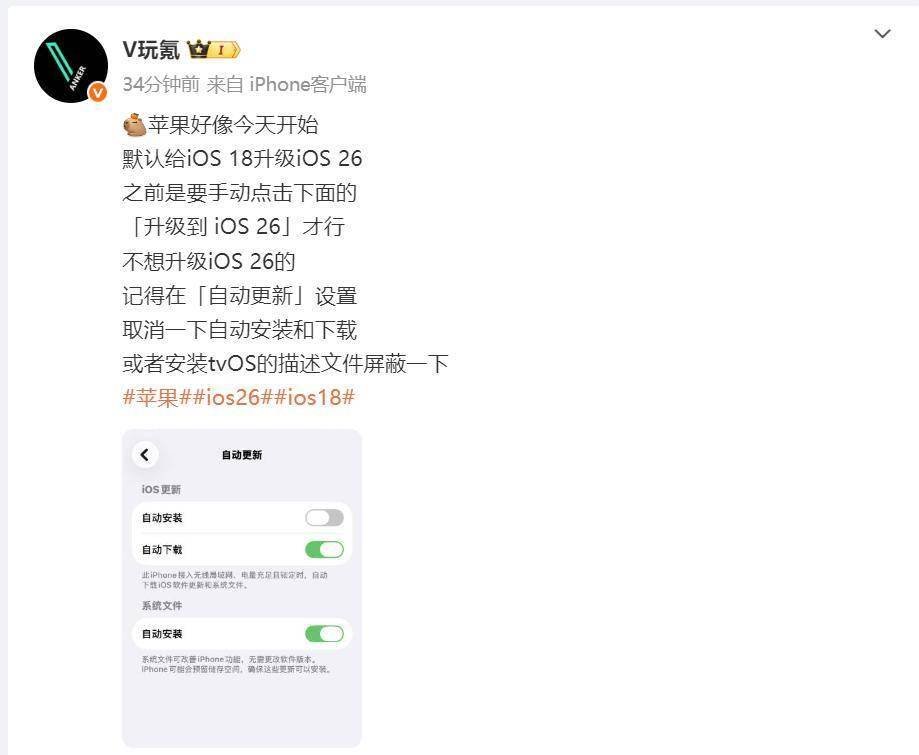 数码博主V玩氪近日发布微博称,苹果公司 从12月3日开始调整了系统更新策略,将iOS 26设置为运行iOS 18设备的默认更新选项,而此前用户需手动选择才能升级到iOS 26。