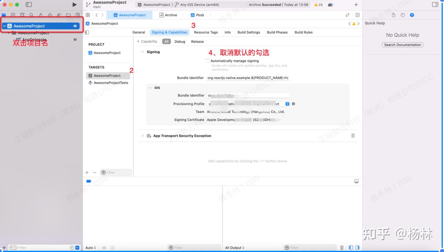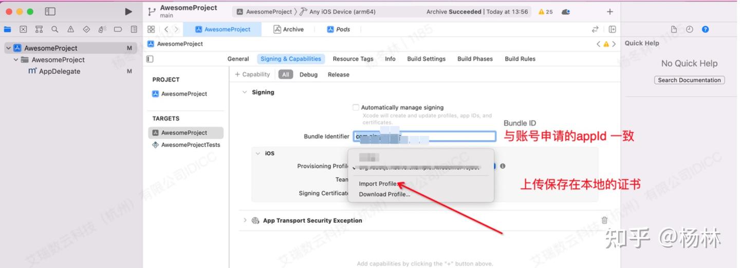 Xcode打开项目,选择Signing & Capabilities选项,取消勾选Automatically manage signing,点击Provisioning Profiles,导入刚下载的profile文件(xxx.mobileprovision):