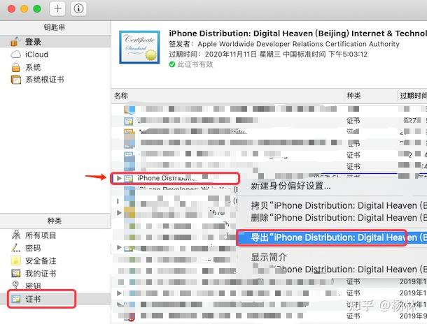 同样双击保存到本地的 ios_production.cer 文件将证书导入到 “钥匙串访问”工具中,可以在证书列表中看到刚刚导入的证书,接下来需要导出 .p12 证书文件,选中导入的证书,右键选择 “导出...”: