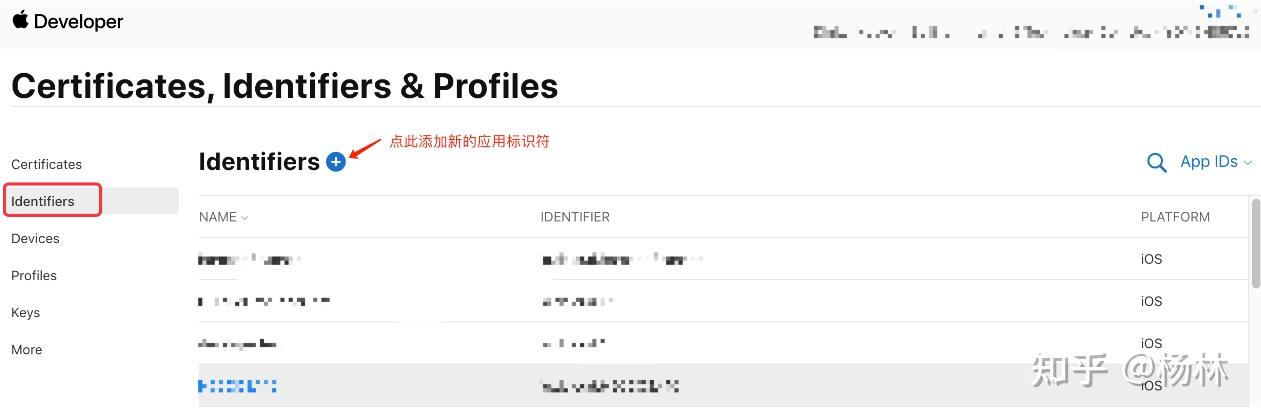 选择页面的 “Identifiers" 可查看到已申请的所有 App 应用标识,点击页面上的加号来创建一个新的应用标识: