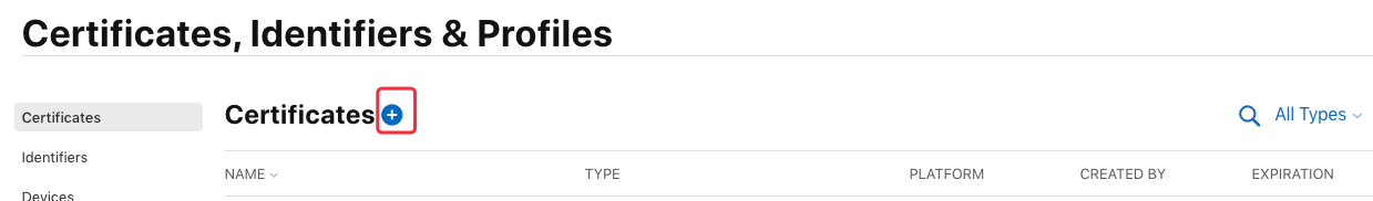 在证书管理页面选择 “Certificates" 可查看到已申请的所有证书(TYPE:Development 为开发证书,Distribution为发布证书),点击页面的加号来创建一个新的证书: