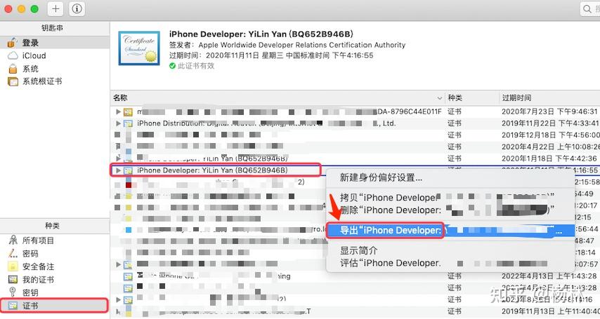 双击保存到本地的 ios_development.cer 文件,会自动打开 “钥匙串访问” 工具说明导入证书成功,可以在证书列表中看到刚刚导入的证书,接下来需要导出 .p12 证书文件,选中导入的证书,右键选择 “导出...”: