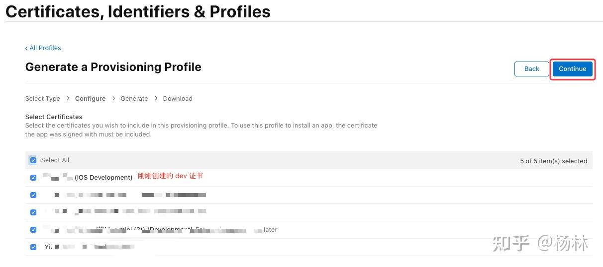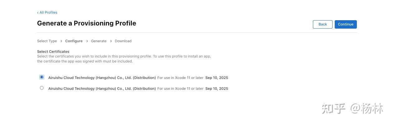 接下来选择需要绑定的发布证书(iOS Distribution),这里勾选刚刚生成的发布证书”,点击“Continue”:
