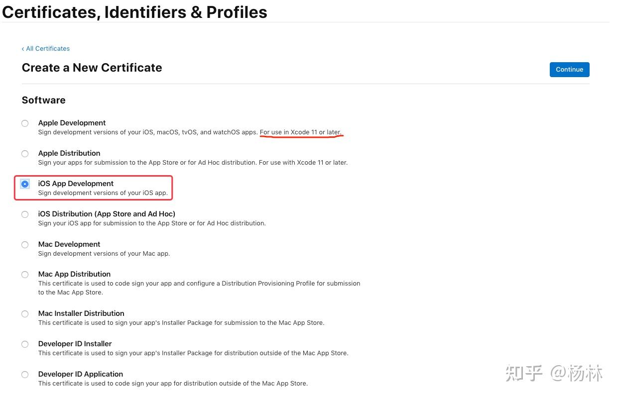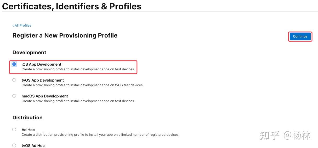 在 “Development” 栏下选中 “iOS App Development”,点击“Continue”按钮: