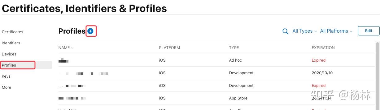 在证书管理页面选择 “Profiles”,可查看到已申请的所有描述文件,点击页面上的加号来添加一个新的描述文件: