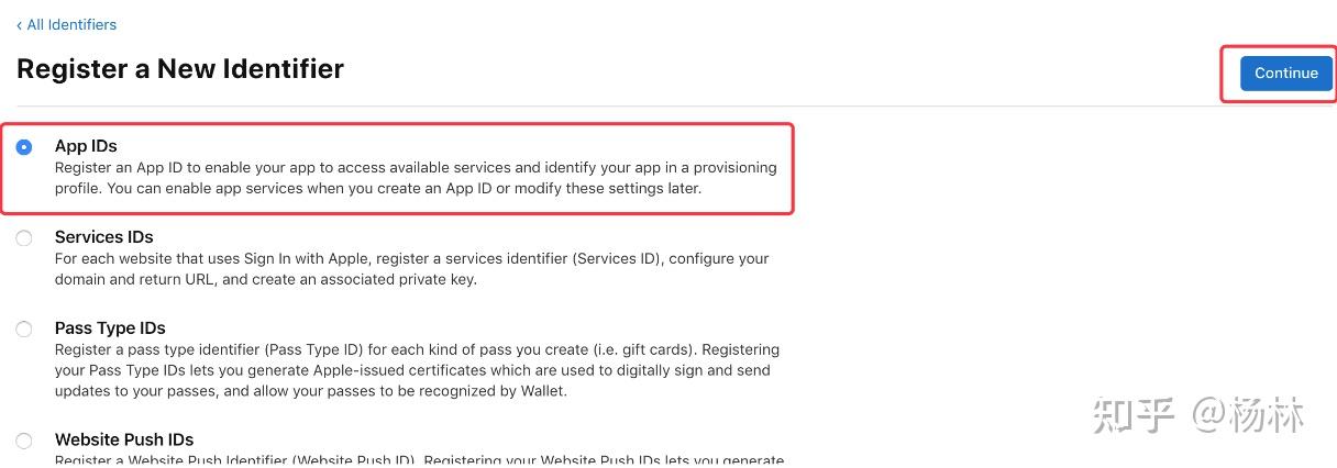 选择标识类型为 “App IDs”,然后点击 “Continue”