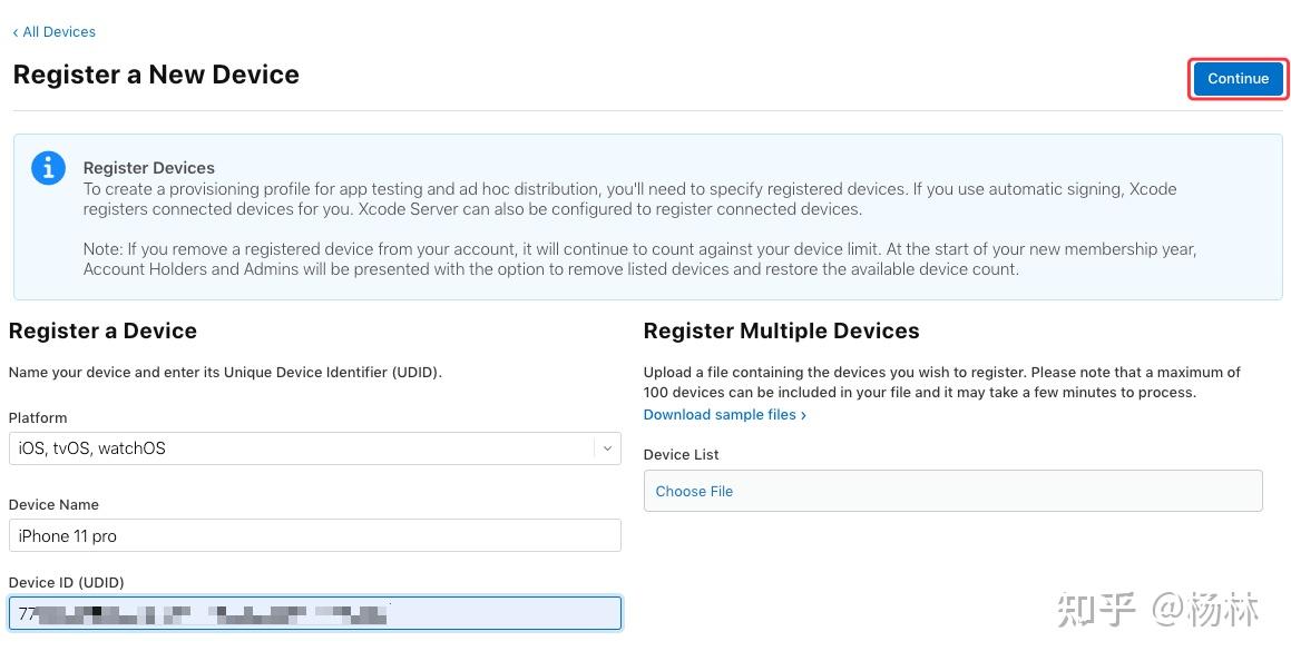 开发描述文件必须绑定调试设备,只有授权的设备才可以直接安装 App,所以在申请开发描述文件之前,先添加调试的设备。