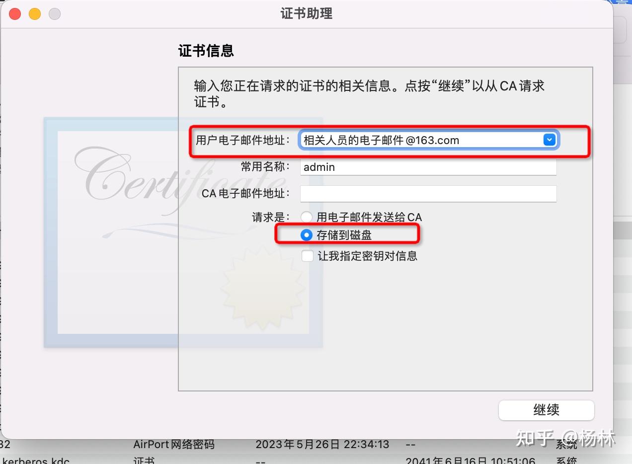 打开创建请求证书页面,在页面中输入用户邮件地址、常用名称,选择存储到磁盘,点击 “继续” :