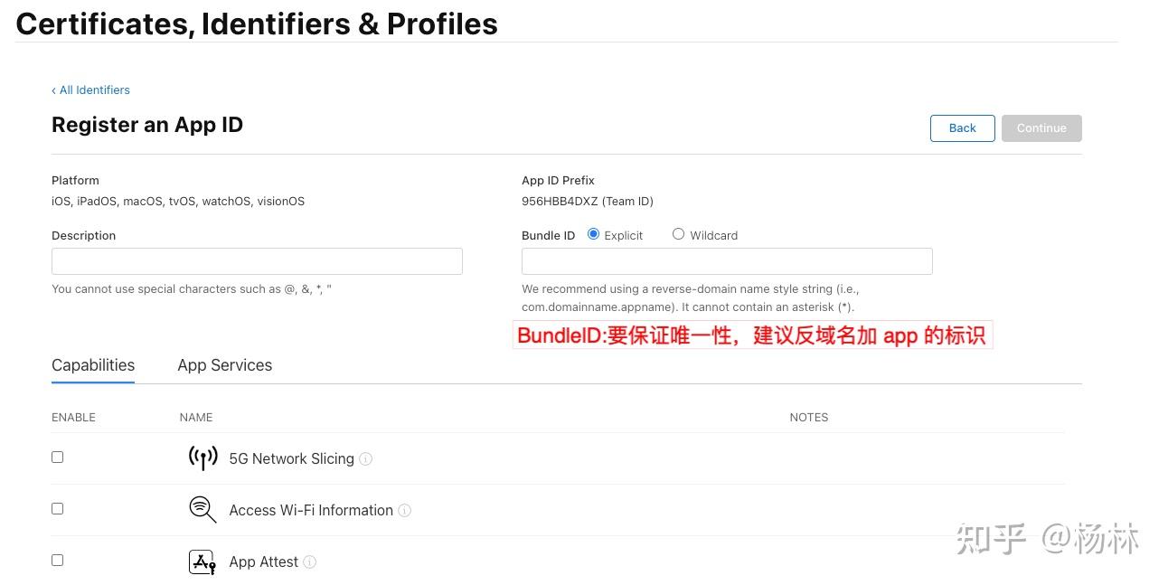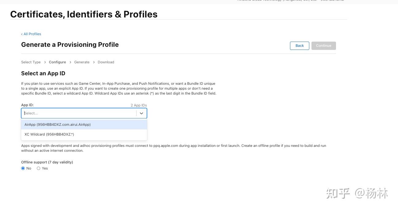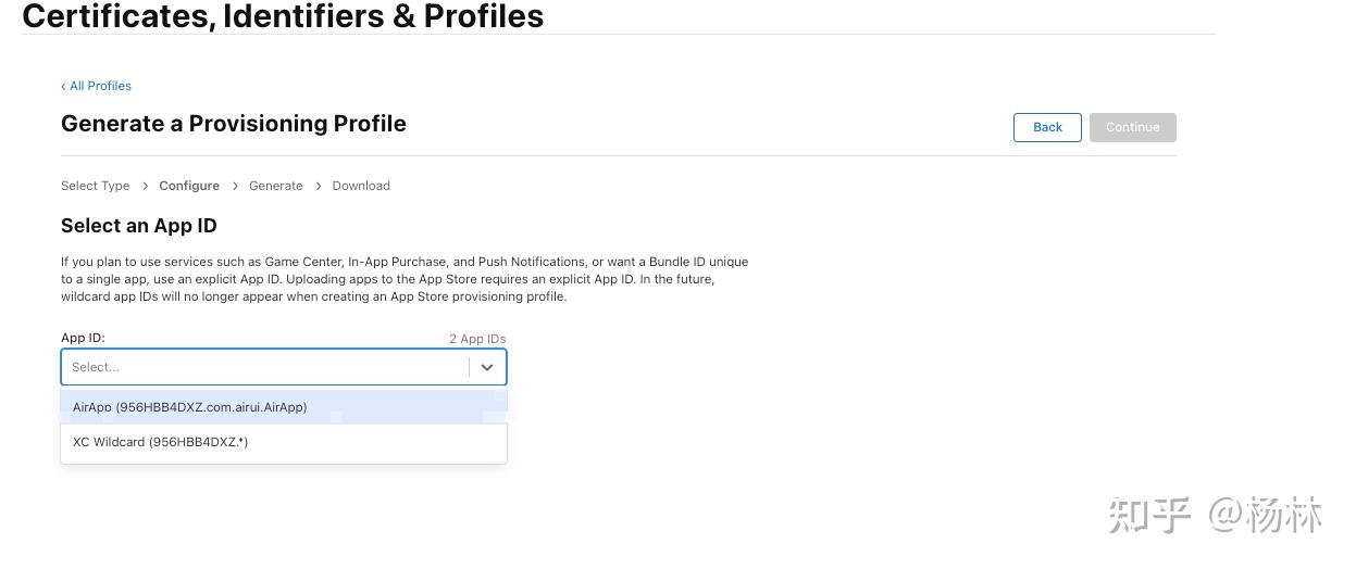 里要选择之前创建的 “App ID”,点击“Continue”: