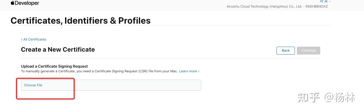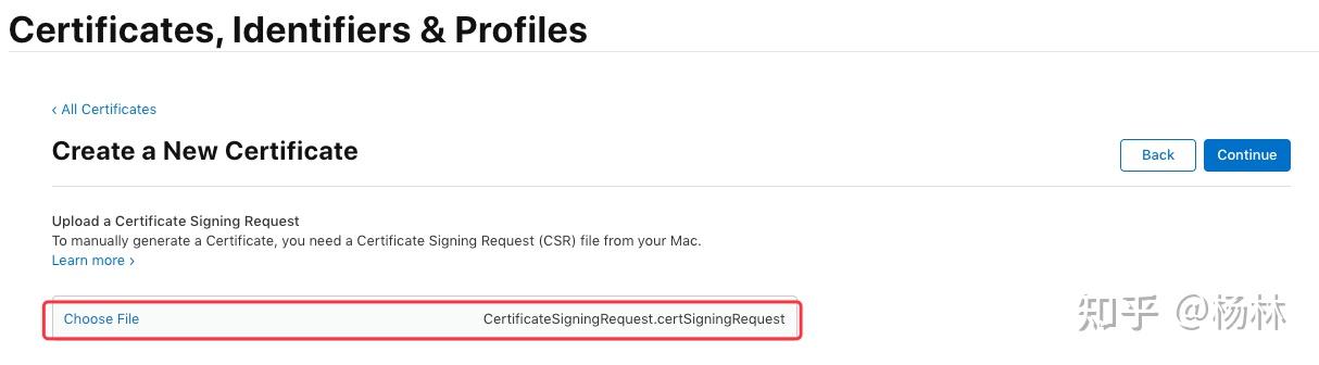接下来同样需要用到之前生成的证书请求文件,点击“Choose File...”选择刚刚保存到本地的 “CertificateSigningRequest.certSigningRequest”文件,点击 “Continue” 生成证书文件: