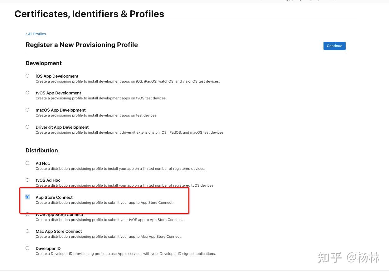 在 “Distribution” 栏下选中 “App Store”,点击“Continue”按钮: