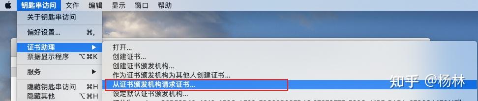 打开菜单 “钥匙串访问”->“证书助理”,选择“从证书颁发机构请求证书...”: