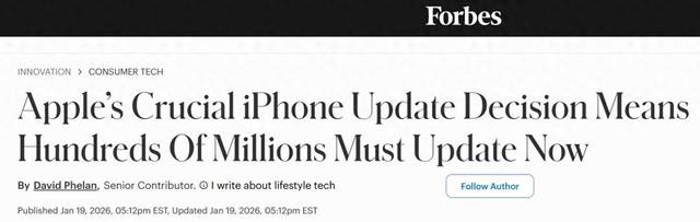 【环球网科技综合报道】1月20日消息,据forbes报道称,苹果公司于2025年12月做出一项关键软件支持决策,正式结束对 iOS 18 系列在绝大多数设备上的安全更新,迫使全球数亿 iPhone 用户必须尽快升级至最新操作系统 iOS 26,以确保设备安全与功能完整性。