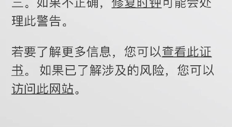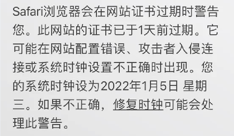 Safari浏览器会在网站证书过期时警告您。此网站的证书已于1天前过期。它可能在网站配置错误、攻击者入侵连接或系统时钟设置不正确时出现。您的系统时钟设为2022年1月5日星期三。如果不正确,修复时钟可能会处理此警告。若要了解更多信息,您可以查看此证书。如果已了解涉及的风险,您可以访问此网站。