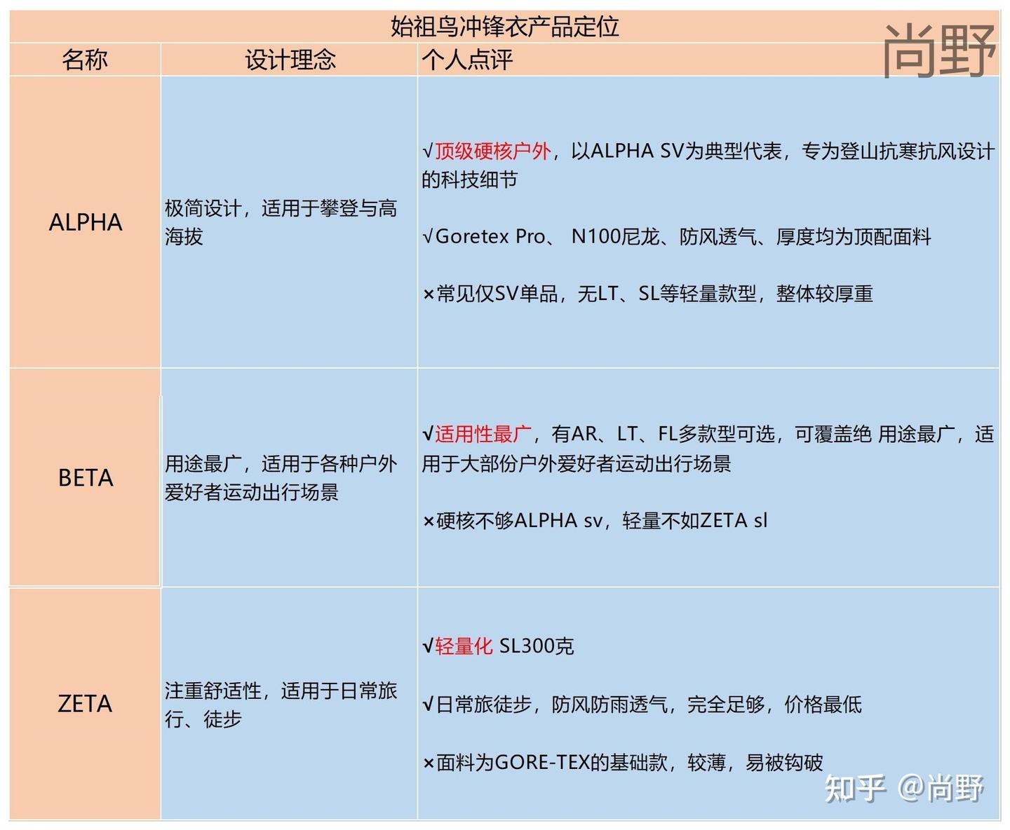 鸟家的硬壳冲锋衣主要分为三个系列,专业性从高到低依次是 Alpha、Beta、Zeta。