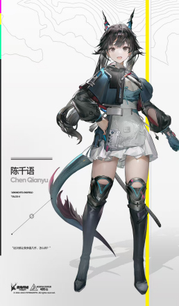 “这次就让我多露几手,怎么样?” 陈千语是终末地工业的特勤干员,也兼任佩丽卡的护卫工作。身为真龙后裔,陈千语的体质与天赋明显异于常人。她自幼研习战术、磨练武艺,这些训练不仅让她收获了过硬的战斗素养,还练就了同龄人中少有的心理素质。 “公理与正义”是陈千语的人生信条。无论身处怎样的环境,陈千语都不会在原则问题上妥协与退让 [15]。 | |