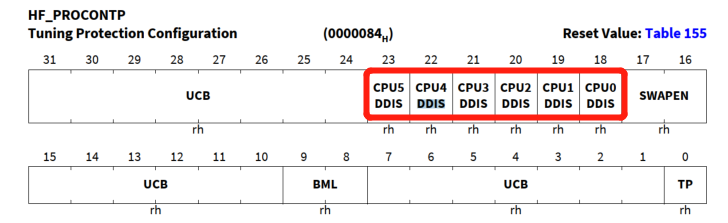 UCB_OTP_PROCONTP.CPUxDDIS | 关闭CPU直接访问PFlash bank的接口 统一改为通过SRI总线访问PFlash | DMU_HF_PROCONTP.DDISx CPUx_FLASHCON4.DDIS | DMU,CPU |