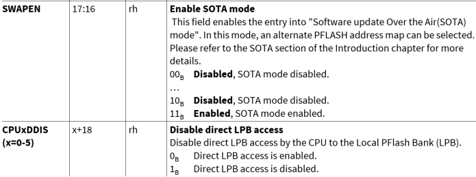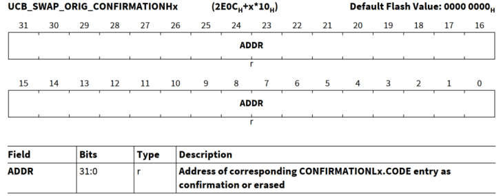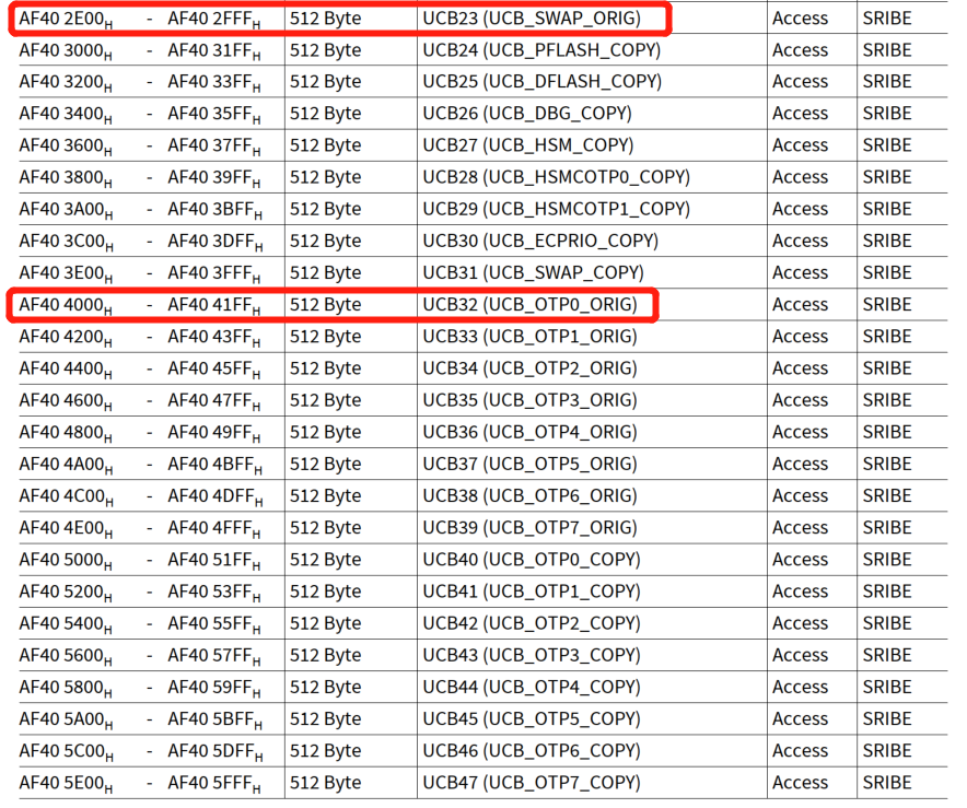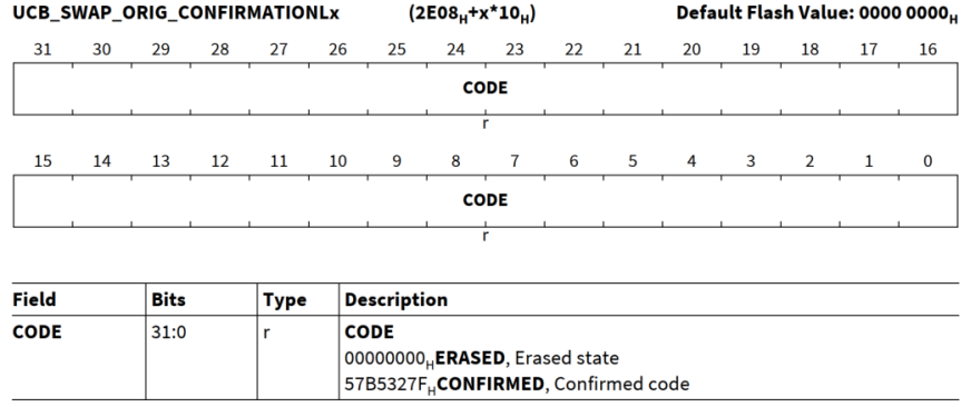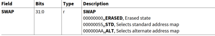 UCB_SWAP_ORIG/COPY | 用户可编程活动地址映射是标准地址映射或备用地址映射。 进入SOTA模式后,根据上述配置选择标准还是备用地址映射 | SCU_SWAPCTRL | SCU |