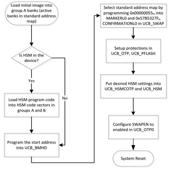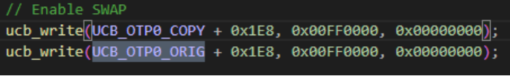 接下来激活SOTA功能,逻辑思路为:选择地址映射方式(SWAP)->确认SWAP条目->写入确认码(CONFIRMATION)->确认CONFIRMATION条目->(如有HSM,考虑将HSM代码放在PF0的sector0-39)->设置UCB_OTP/WOP保护->使能SWAP(SWAPEN)->重启系统