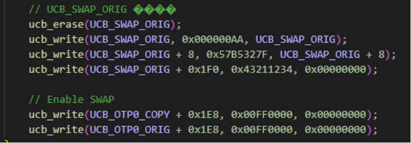 首先配置的是UCB_SWAP.MARKETL0= 0xAA(选取备用地址映射模式);然后将MARKETL0的地址写入MARKETH0予以确认;将0x57B5327F写入CONFIRMATIONL0,最后将CONFIRMATIONL0地址写入CONFIRMATIONH0予以确认。最后使能SWAP功能。