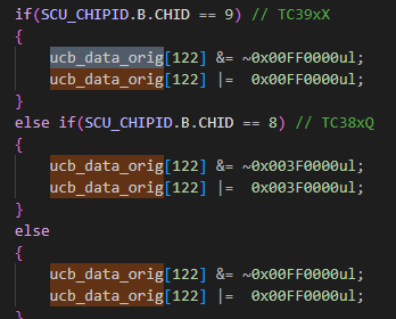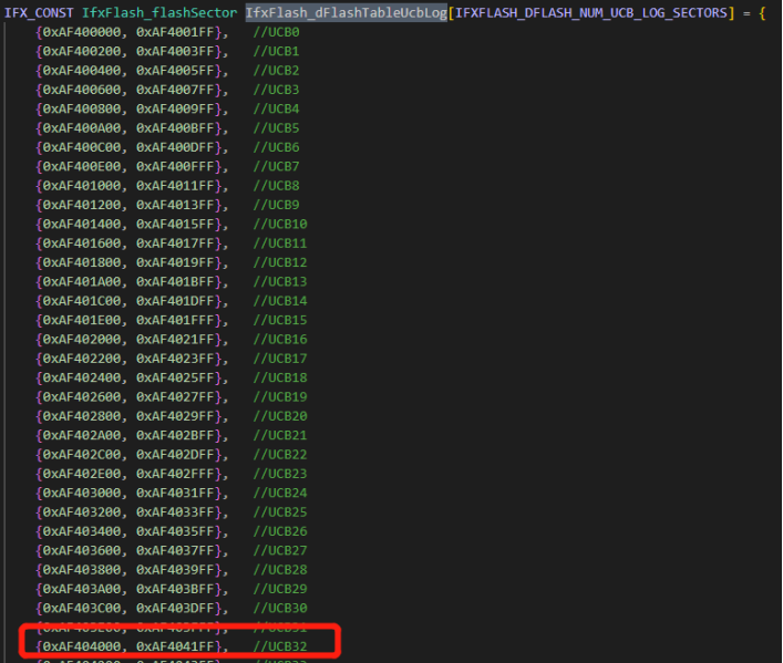 根据上述对UCB32(SWAP_OTP0_ORIG)结构分析,我们可以设计一个uint32 UCB_OTP_ORIG[128](512byte/4);其中PROCONTP的位置位于UCB_OTP_ORIG[128-6](6 = (0x200-0x1e8)/4)。