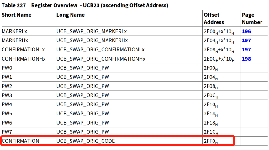假设上次SOTA升级成功,现在已经运行的PF2/3的代码;此时又有SOTA升级需求,这个时候如何来配置SWAP信息?TC3xx提供了多达16个UCB_SWAP配置entry。很明显此时配置新的SWAP就需要在MARKETL1写入0x55(标准地址映射模式),MARKETH0、CONFIRMATION同上述配置一样。