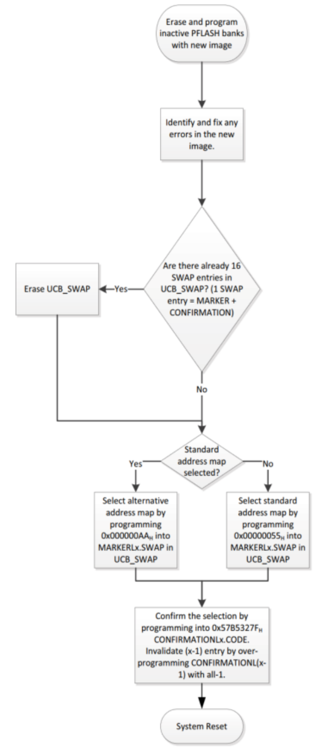 擦除完毕之后,接下来就是刷写这块inactive bank。数据从哪里来?很明显,可以通过CAN或者ETH接口接收并暂存数据(通常为4096bytes),并异步调用fls接口进行刷写。刷写程序这一套参考内置uds的bootloader程序。 刷写并校验完毕之后,正常情况就是要配置SWAP信息,例如地址映射模式为备选映射模式,这样就能保证PF2/3在下次启动后的逻辑映射地址为0xA000 0000。