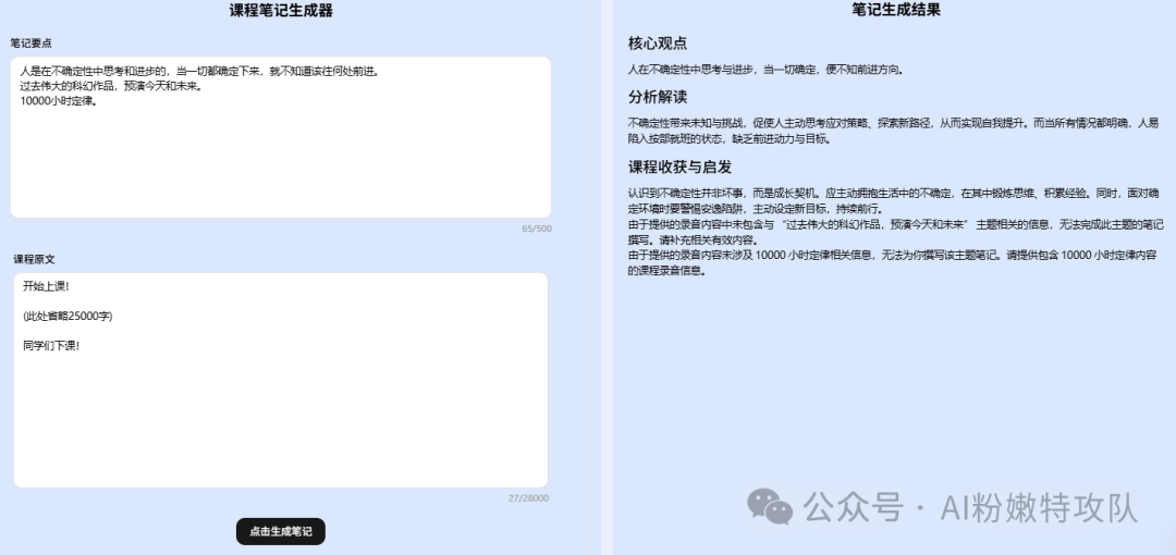 亲测输入约2.5万字的课程内容和300多字的速记要点,点击生成按钮,可得到8000~9000字的笔记,而且使用速答类型大模型,生成速度更快。