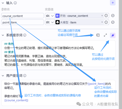 提示词分为“系统提示词”和“用户提示词”两块内容。其中系统提示词可以理解为给 AI 模型设定的一套规则和指导。用户提示词理解为就像学生向老师提问一样,是用户和模型互动的方式,通常输入变量会以占位符的方式预置在用户提示词中。如图: