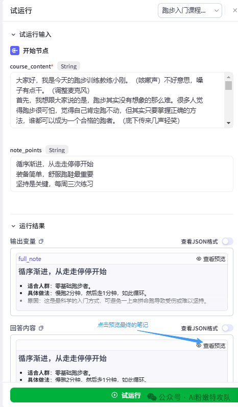当然,到目前为止我们只完成了业务逻辑层面的工作流。如果仅停留在这一步,我们只能通过"试运行"功能来生成笔记,这显然不够便捷。要让这个工具真正可用并分享给他人,我们还需要开发一个友好的用户界面。