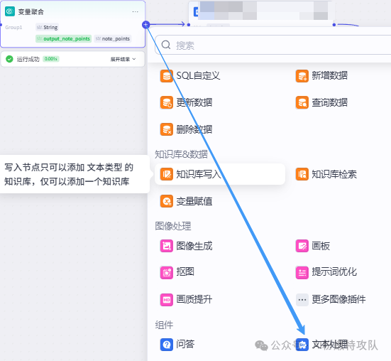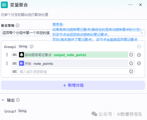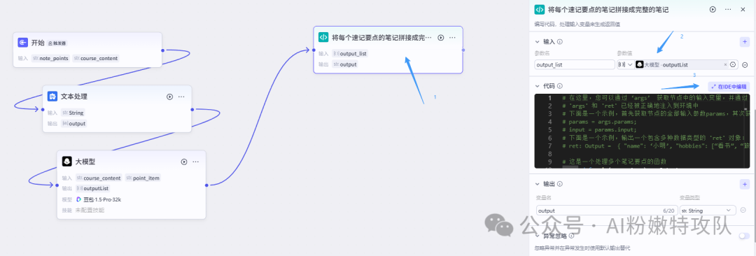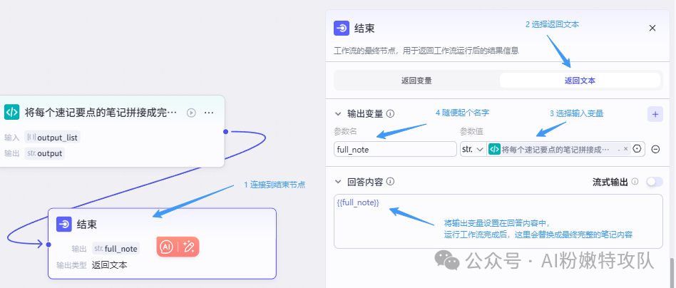 "output": text # 返回合并后的完整笔记 固定写法,这里"output"要和节点配置界面上的输出变量名一致
