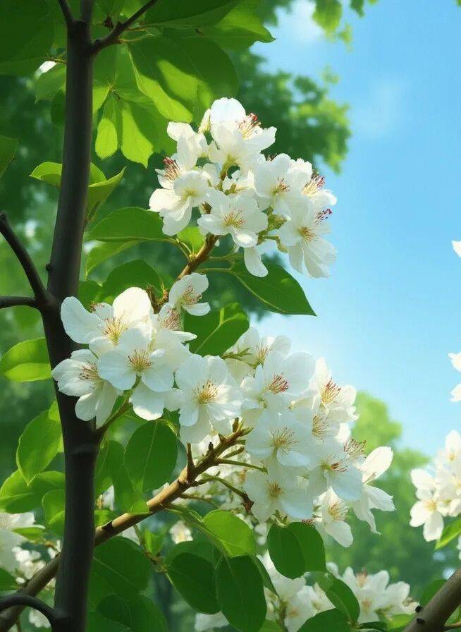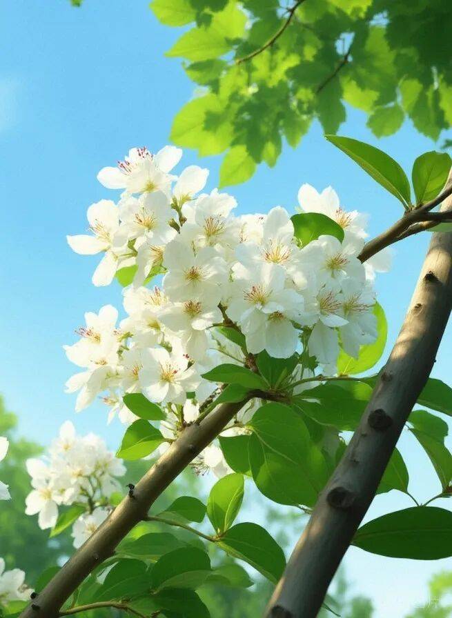 •花簇生且花梗长:梨花多为6-10朵簇生,花梗细长,和樱花一样成簇开放,但花瓣更宽大,没有缺口,且叶片较大、边缘有明显锯齿。