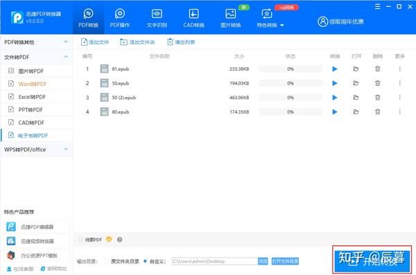 进入软件后,点击【epub转PDF】功能栏,上传你的epub文件,可以批量上传。点击立即开始,既可以保存在本地电脑文件夹里。