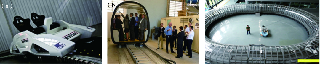 自20世纪末以来,超导材料发展迅速,超导转变温度逐渐提高,液氮温区超导悬浮技术成为可能。超导钉扎型悬浮是其中一个重要技术分支,其利用液氮温区超导材料对磁场的钉扎效应,保持列车在永磁轨道上的稳定间隙状态。超导钉扎型悬浮可以是斥力悬浮,也可以是吸力悬浮。系统构造特点是车辆底部安装液氮温区超导块材,轨道上铺永磁体,利用磁场钉扎效应实现悬浮与导向,采用长定子直线同步电机驱动。西南交通大学对上述技术的可行性进行了初步探索。除中国外,其他国家也进行了一些试验。德国材料研究所研制了“SupraTrans”试验车(图4);巴西里约热内卢联邦大学研制了“Maglev-Cobra”试验车,可载客30人,并在校园内建200 m试验线,试验速度约7 km/h(图4);俄罗斯、日本、意大利等国家也开展了原理性试验研究。