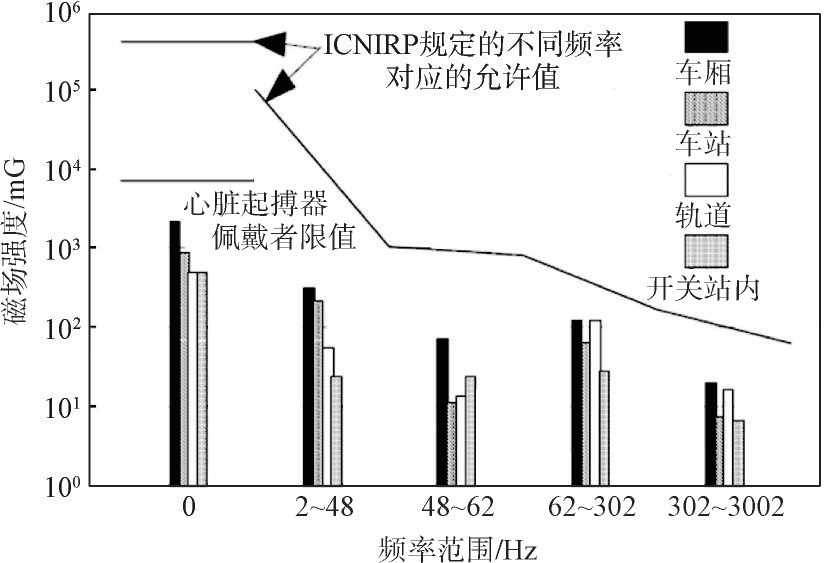 图8为美国交通部研究人员对德国TVE试验线车厢、车站、轨道和开关站内测得的静磁场和交变磁场强度最大值,并与电磁暴露相关国际标准中最严格的标准(国际非电离辐射防护委员会(ICNIRP)标准)进行的比较。上述测量场合反映了乘客、社会公众和磁浮交通从业人员可能受到的最大辐射可能。测量结果表明,各种场合测得的电磁暴露水平均低于ICNIRP标准的限值。