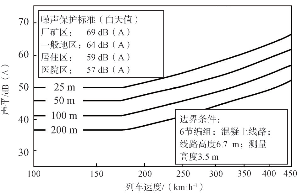 图6表明,只要将线路距敏感区域的距离进行适当控制,就能使磁浮铁路的噪声影响不超过规范规定的数值。例如,对于对噪声最敏感的医院区,只要将线路与医院的距离控制在不小于100 m,磁浮列车就能以450 km/h的速度运行;对于厂矿区,则几乎不受距离控制,磁浮铁路与厂矿区的距离将受安全条件(大于25 m)而不是噪声条件控制。在中国磁浮铁路应用研究中,可参考《城市区域环境噪声标准》(GB 3096—2008)和《铁路边界噪声限值及其测量方法》(GB 12525—1990)制定相应的城市区磁浮铁路的限速或限距参数。