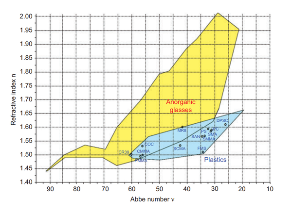 塑料的确不利于控制色散,我们从上图可以看到,塑料虽然能实现 1.6 左右的高折射率,但阿贝数都是偏低的,这意味着更弱的色差矫正能力。